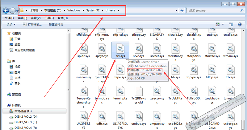 把鼠标放在srv.sys的文件上,会看到文件说明提示框,里面包含“文件版本”,我们要看的就是这个版本信息。