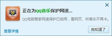 QQ电脑管家右下方气泡自动提示保护进程,“正在为QQ音乐保护网速...”,此时应用QQ音乐播放歌曲,很流畅。