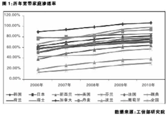 近几年宽带家庭渗透率逐年提高,图1显示了世界主要国家的宽带家庭渗透率。可以看出,日韩等国家的宽带渗透率远远高于世界其他国家,图中全国宽带普及率为我国的普及率,还处在较低的水平。