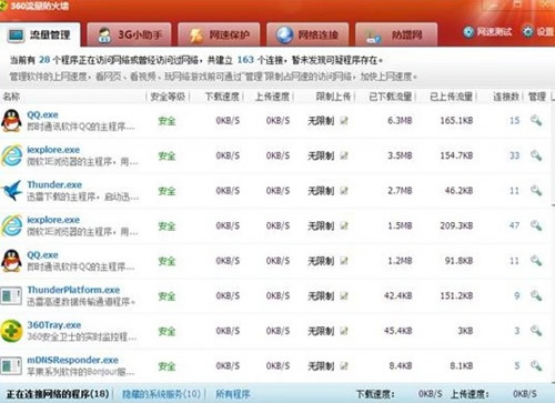 通过360流量防火墙的“流量管理”功能,我们看看哪些程序在后台偷偷蚕食用户宝贵的流量呢?