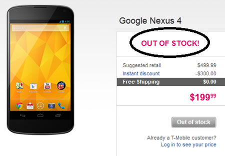 Google Nexus 4自从11月13日上市以来便一直缺货,如果你还想购买Nexus 4的话,那么Google建议你通过T-Mobile进行购买,不过通过T-Mobile购买的话,要么你去接受2年的合约,要不就多花100美元。