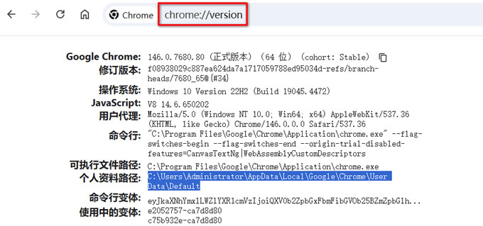要想知道Chrome扩展程序、书签等个人资料的存放文件夹目录位置,可以在Chrome浏览器地址栏输入 chrome://version ,按下回车键。