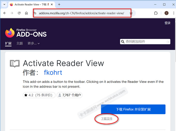 这时在网页右侧的“下载Firefox并安装扩展”按钮的下方看到“下载文件”几个字,这就是该扩展程序的xpi文件,直接点击它即可下载保存。