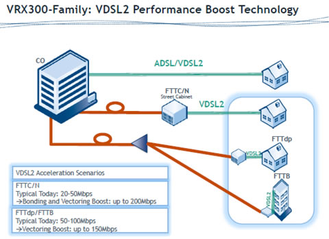 Lantiq近日推出了其新产品XWAY VRX300,能解决这一过渡过程中的问题。据Lantiq亚洲区副总裁吴晓东介绍,VRX300是公司VDSL芯片组系列的新一代产品,使用该芯片组设计的网关能达到200Mbits(采用两对双绞线绑定技术)和高达150Mbits(采用系统级串扰消除的vectoring技术)的数据传输速率,而且同时还支持一系列家庭联网功能,包括内置的WLAN(Wi-Fi)、千兆以太网和VoIP等。