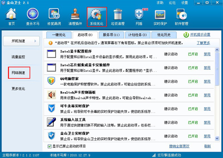 打开免费安全套装中的金山卫士,点击系统优化此时左侧会出现弹窗“网络测速”选项。