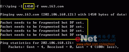 2. 输入命令“ping –l 14xx –f www.163.com”,这里我们解释一下命令参数的含义