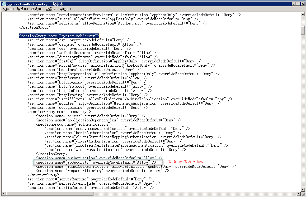 找到 <sectionGroup name="system.webServer"> 这个节点,然后把此节点内的下面这行: