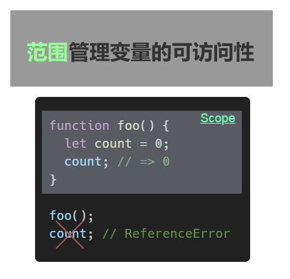 但是,超出foo()范围,count是无法访问的。如果你尝试从外部访问count,JavaScript 会抛出ReferenceError: count is not defined。