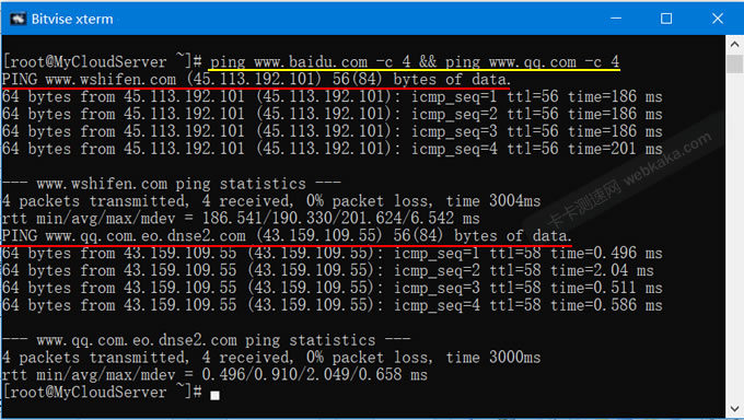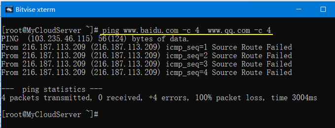 在linux里,ping命令忽略了第一台主机,并开始ping第二台(或最后一台),命令中 -c 4 表示执行4次ping。