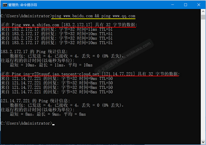 所以,一条Ping命令同时Ping多台主机的写法就是使用“&&”符号连接所有需要执行ping命令的域名或IP,这个写法可以说是精简了一个域名一行ping的传统写法。