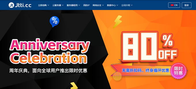 Jtti周年促销:全场限时80% off,CN2云服务器$24.62/年,日本轻量云服务器200M优化独享$35/年,终身循环折扣