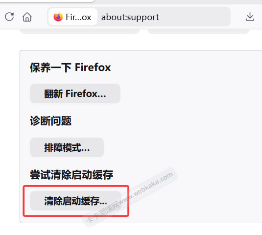 完成第2步之后,我们在 about:support 页面,清除一下浏览器的启动缓存,以接受更改。